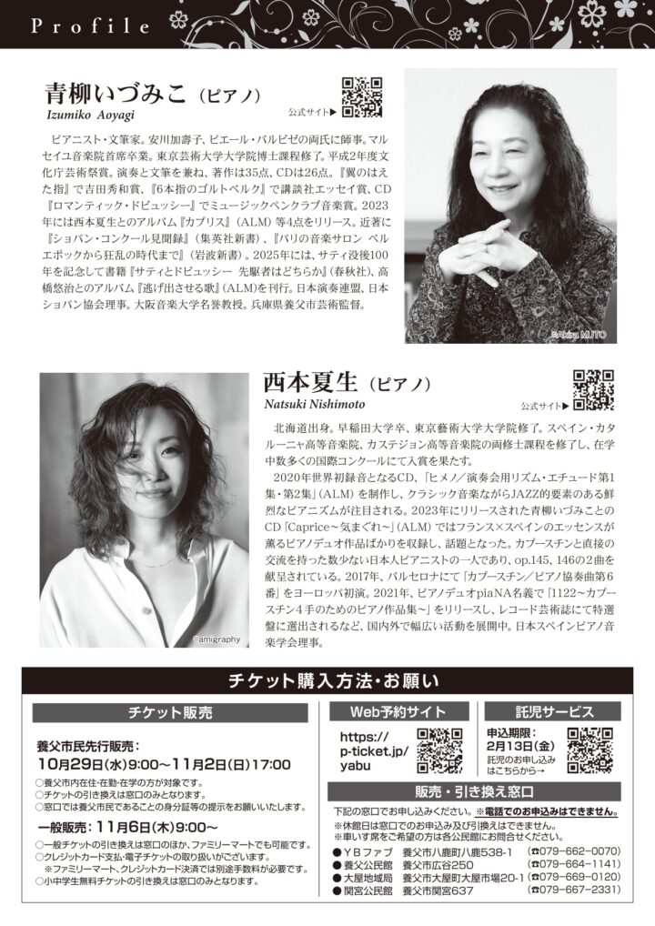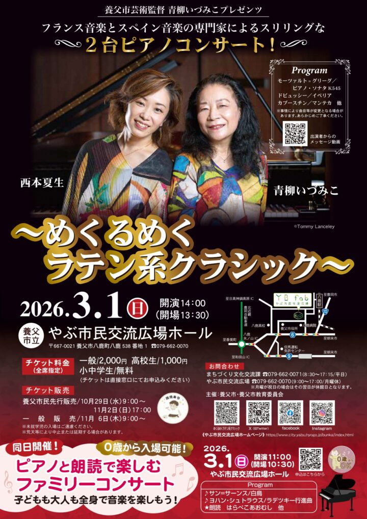 養父市芸術監督・青柳いづみこ氏と、西本夏生氏による2台ピアノコンサート。