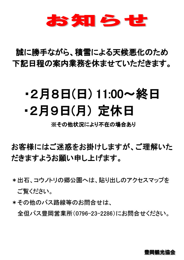 観光についてのお問合せは、「豊岡市役所・観光政策課(TEL:0796-21-9016)」へお願いいたします。