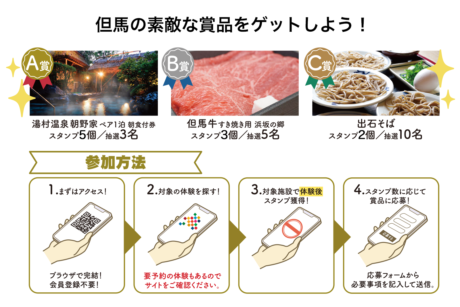 今回は「但馬フィールドパビリオン・デジタルスタンプラリー」と題し、「ひょうごフィールドパビリオン」の但馬エリア(豊岡市・朝来市・養父市・香美町・新温泉町)や、観光施設のプログラムを体験して、デジタルスタンプを集めたら、但馬の豪華賞品を抽選でプレゼントします。